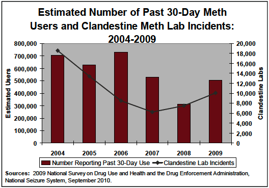 Finally, the number of clandestine meth lab incidents is on the rise. After peaking in 2003 at 17,356, such incidents reached a low of 6,233 by 2007. But, in 2009, the number of incidents increased to 10,064. Although DEA statistics for 2010 will not be final until July 2011, several states, specifically Tennessee, Oklahoma, Missouri, and Indiana, report significant increases in the number of meth lab seizures from 2009.